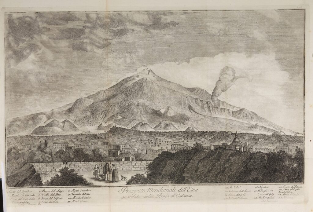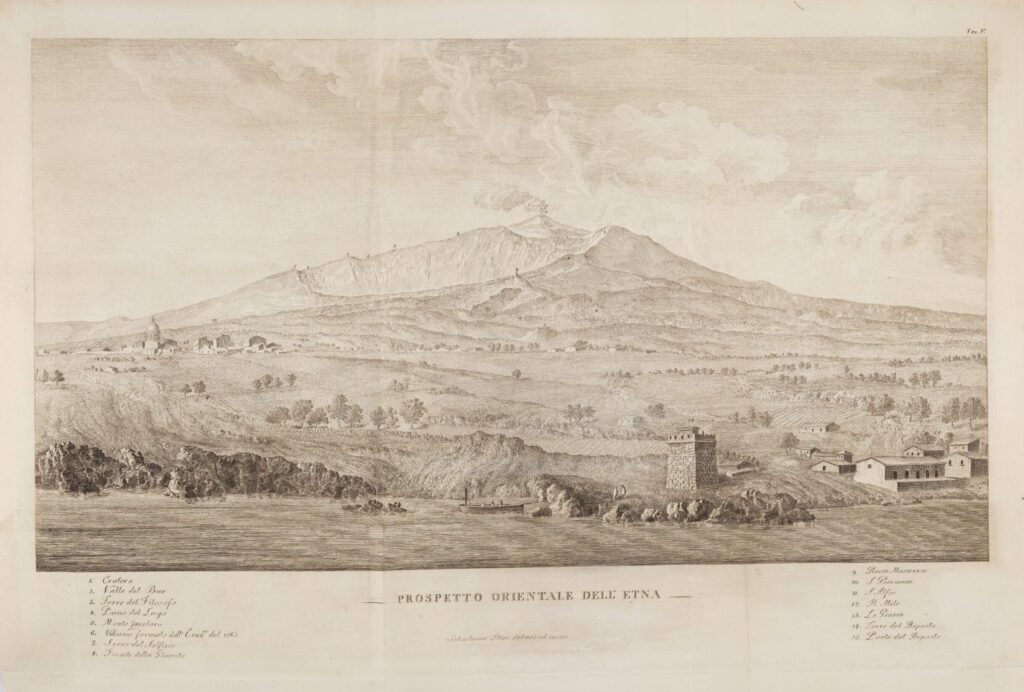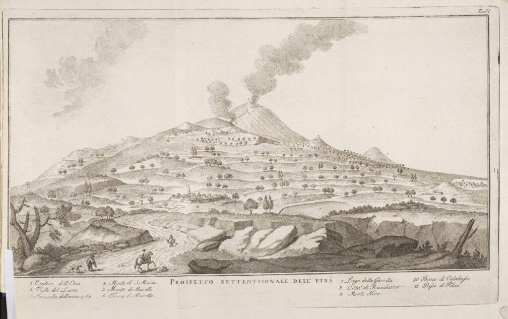 Nella tav. VI è visibile l’eruzione dell’Etna del 1764, con l’indicazione di un corso di lava che fuoriesce dalla una bocca aperta sul fianco settentrionale del vulcano (3).