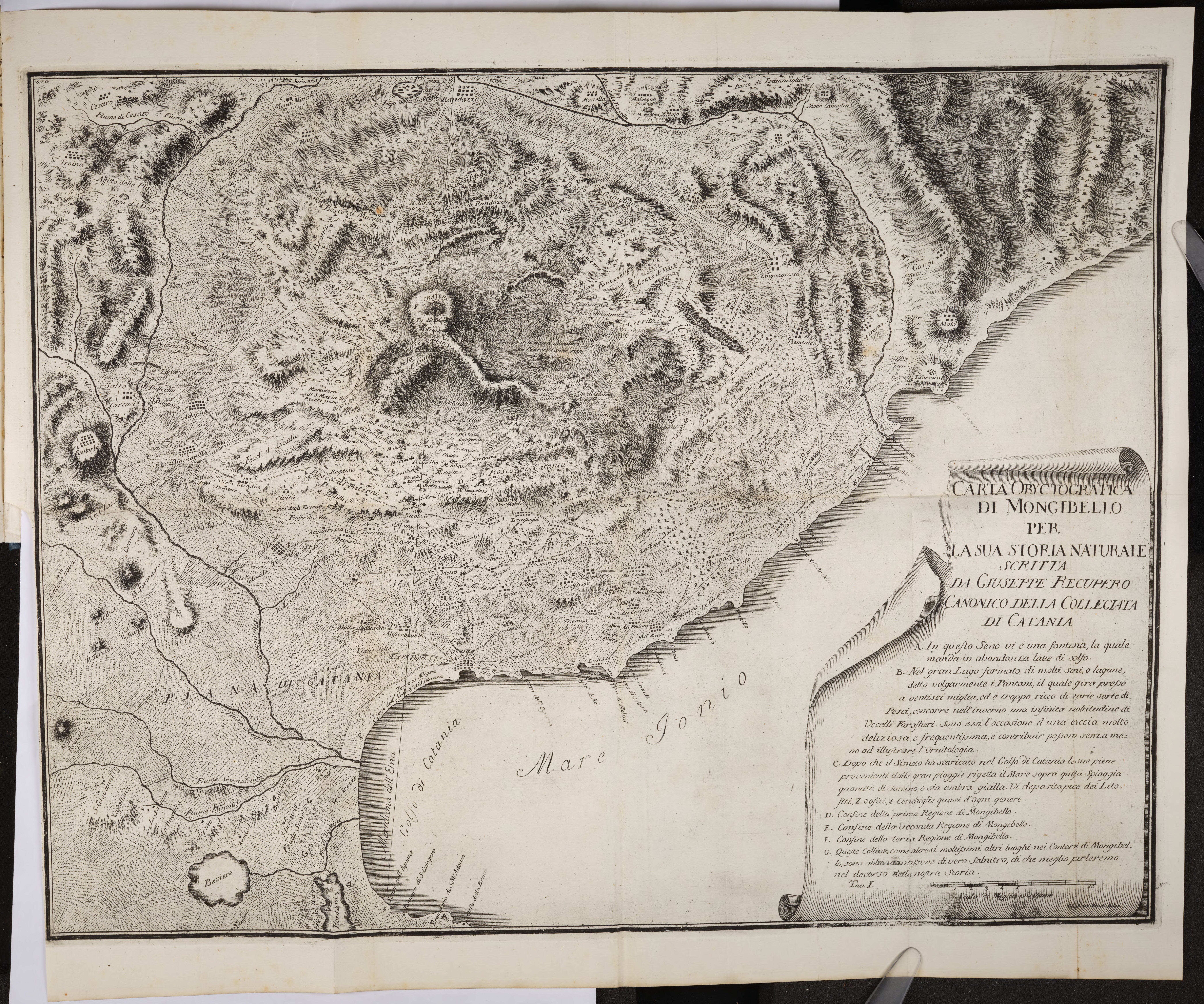 La mappa – in seguito ripresa e aggiornata, tra gli altri, da Francesco Ferrara e Jean Houël – raffigura le tre regioni dell’Etna descritte da Recupero nella sua opera, vale a dire quella pianeggiante e pedemontana, quella intermedia e boscosa e, infine, la terza, collocata alle quote più alte. La mappa cerca di dare conto della morfologia del massiccio etneo, senza trascurare l’idrografia e l’indicazione dei centri urbani, mentre le note richiamano l’attenzione su alcuni siti rilevanti dal punto di vista geologico o naturalistico. Inoltre, la carta reca la localizzazione delle eruzioni più recenti del secondo Settecento, nonché di qualche evento passato particolarmente significativo. La semplice mappa topografica assume così una profondità storica, anche se va sottolineata l’assenza di indicazioni dei corsi di lava e delle bocche laterali, solo accennate.