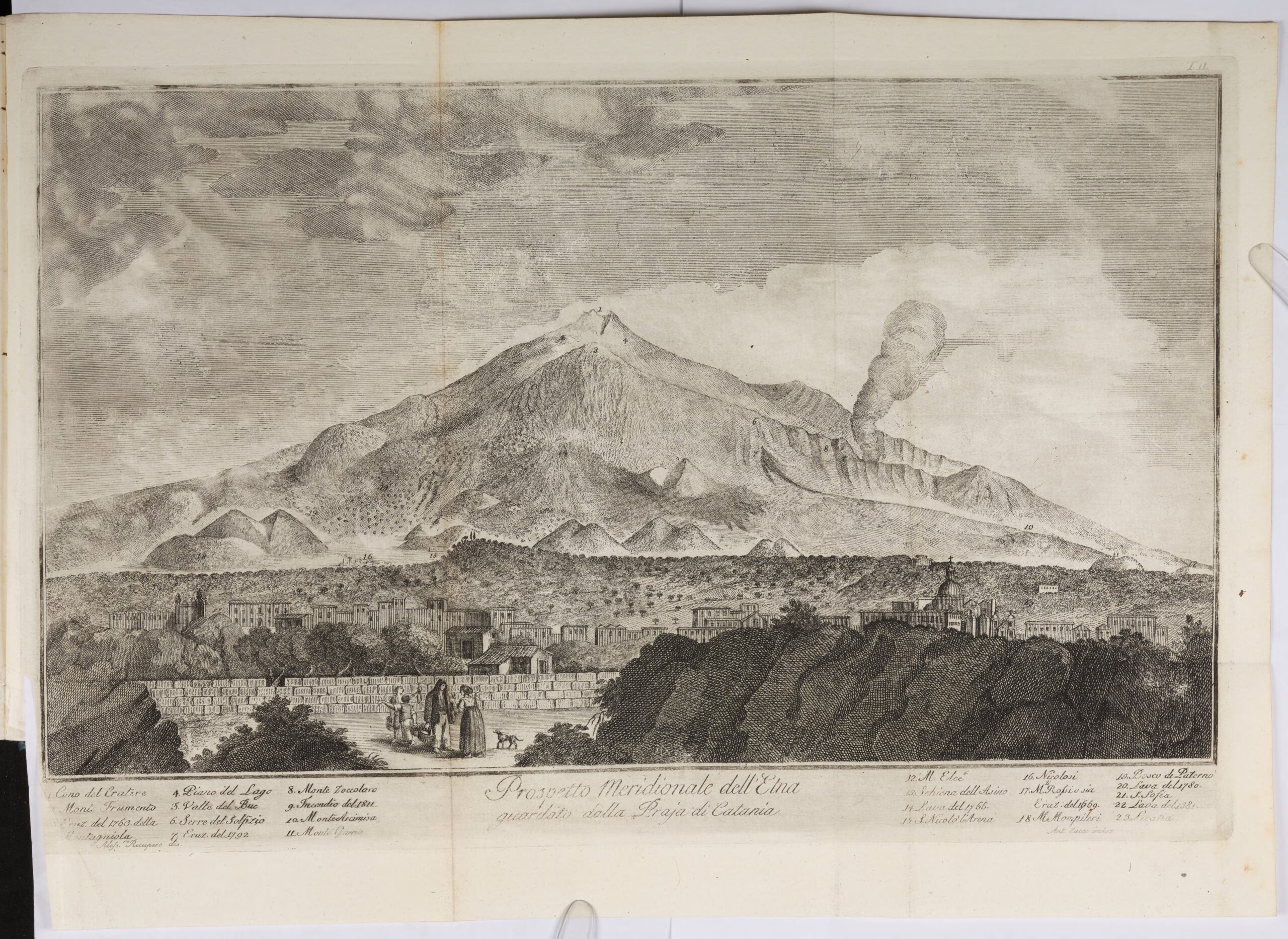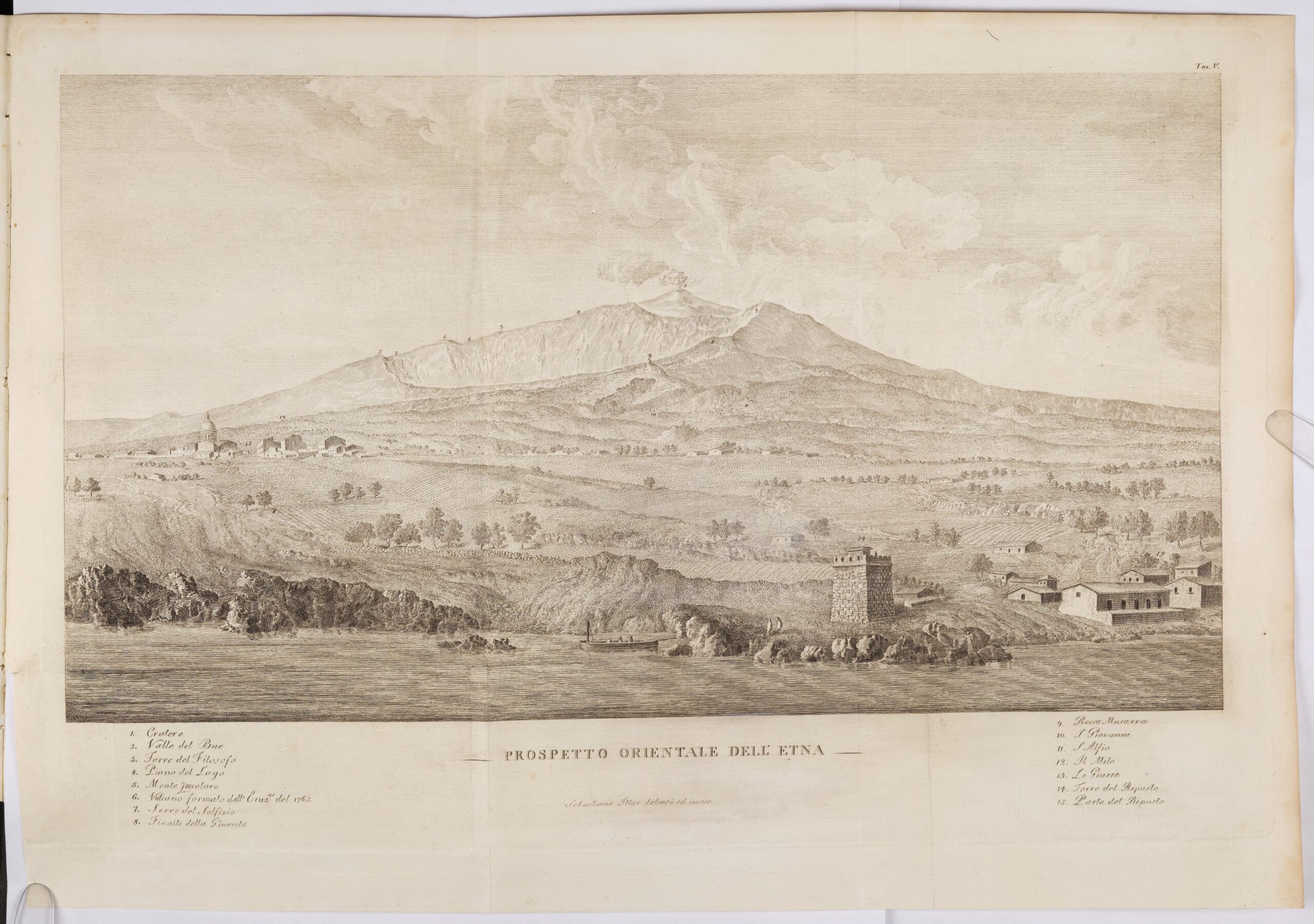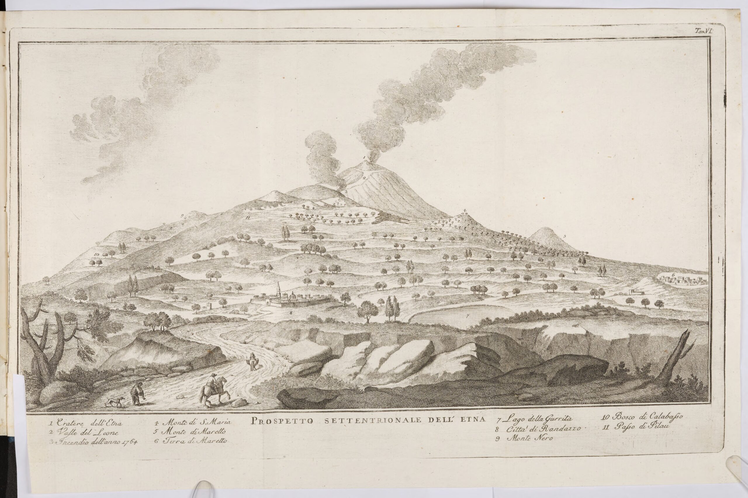Nella tav. VI è visibile l’eruzione dell’Etna del 1764, con l’indicazione di un corso di lava che fuoriesce dalla una bocca aperta sul fianco settentrionale del vulcano (3).