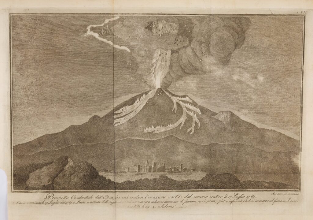 La tavola mostra tre distinte colate laviche fiammeggianti, che prendono diverse direzioni lungo il versante occidentale dell’Etna e che furono eruttate dal cratere centrale il 17, il 18 e il 19 luglio 1787: