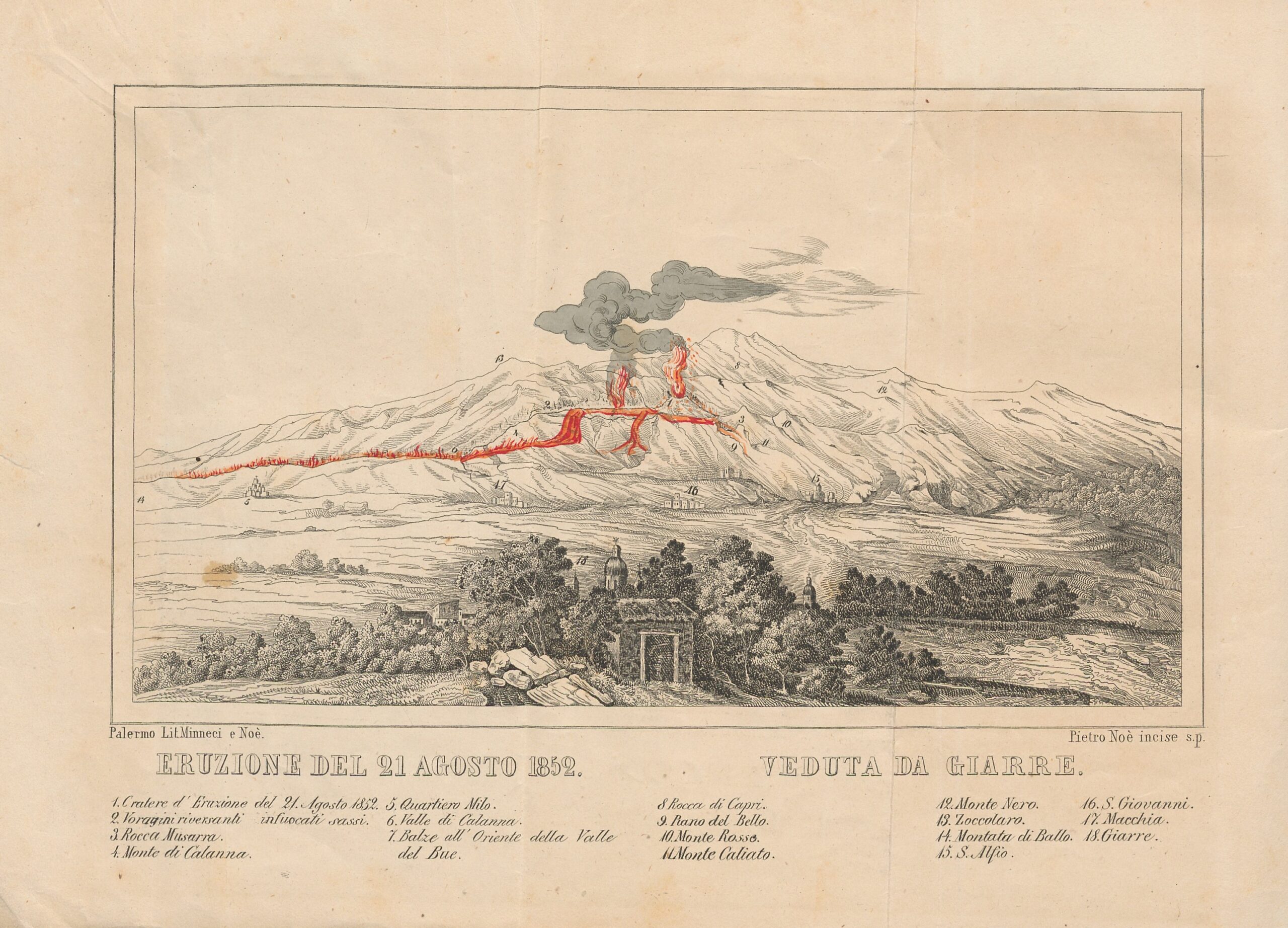 Giuseppe Antonio MERCURIO, Relazione della grandiosa eruzione Etnea della notte del 20 al 21 Agosto 1852, Palermo, Stamperia di Pietro PENSANTE 1853. Litografia. Disegnatore: anonimo. Litografo: Pietro NOÈ, Litografia MINNECI e NOÈ.