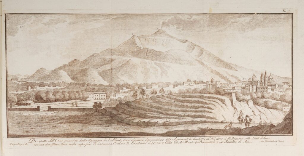 Giuseppe RECUPERO, Storia naturale e generale dell’Etna, a cura di Agatino RECUPERO, Catania, Stamperia della Regia Università degli Studj, 1815, vol. 1 e vol. 2. Tav. III. Incisione su rame. Disegnatore: Luigi MAYER. Incisore: Antonio ZACCO.