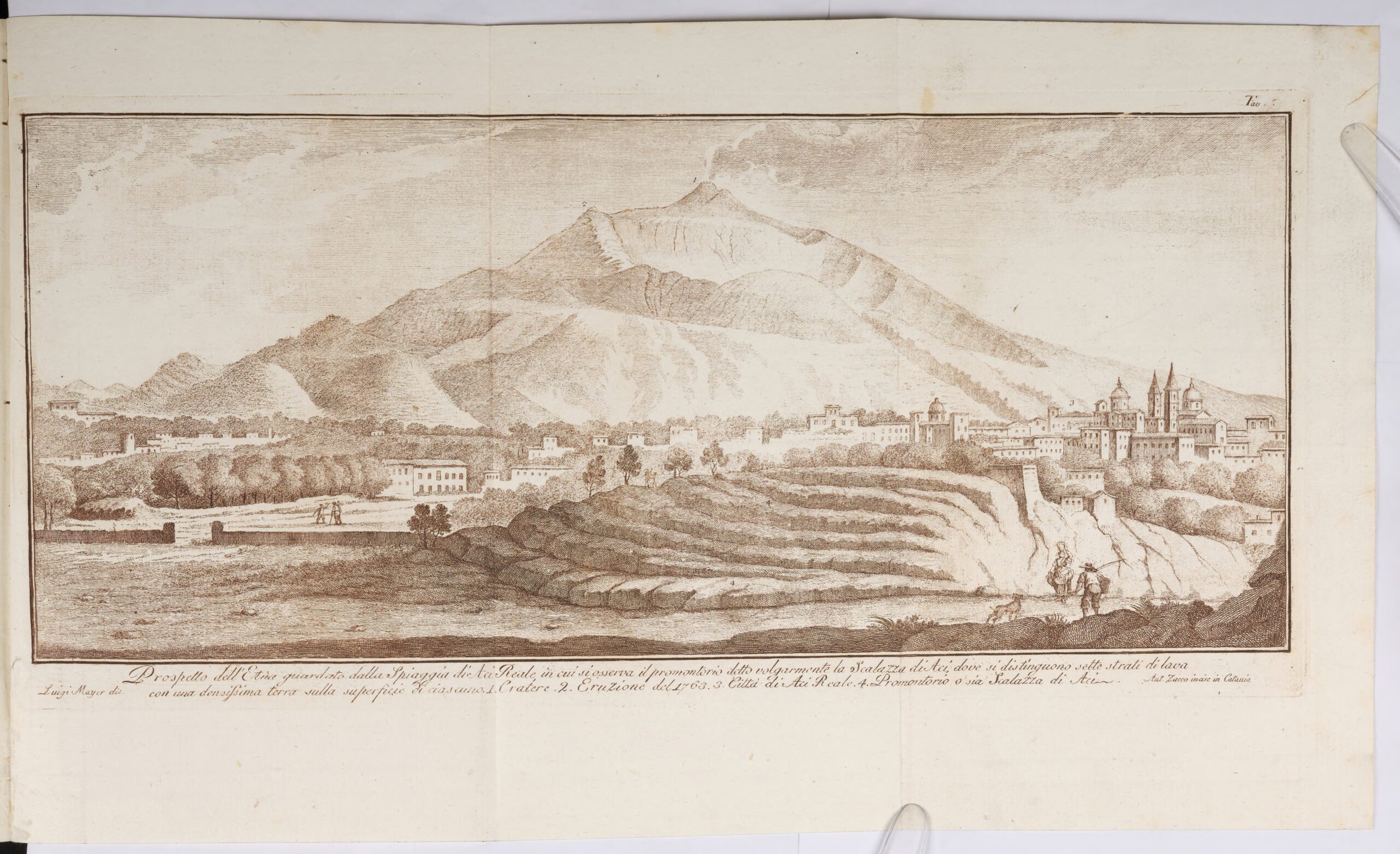 La veduta è presa “dalla Spiaggia di Aci Reale” e spazia su tutto il versante sud-orientale dell’Etna, con la Valle del Bove e l’indicazione della Montagnola (2), sede dell’eruzione del 1763 avvenuta poco prima della realizzazione della tavola. In primo piano è visibile l’abitato di Acireale (3) posto al di sopra della Scala (4) che digrada verso il mare. Sono chiaramente rappresentati i gradoni lavici, ma va segnalato che le dimensioni della formazione geologica appaiono scarsamente corrispondenti al vero e non rendono l’idea della sua reale altezza.