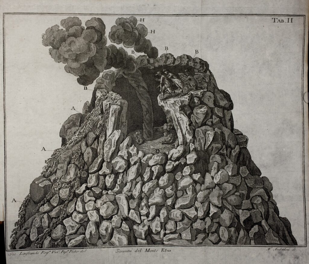 Nonostante al momento dell’escursione di Spallanzani non fosse in corso alcuna eruzione, il naturalista si trovò di fronte a dei corsi di lava provenienti dal cratere centrale e risalenti all’ottobre del 1787, che occupavano il versante occidentale del cono e sono indicati nella tavola con la lettera A: