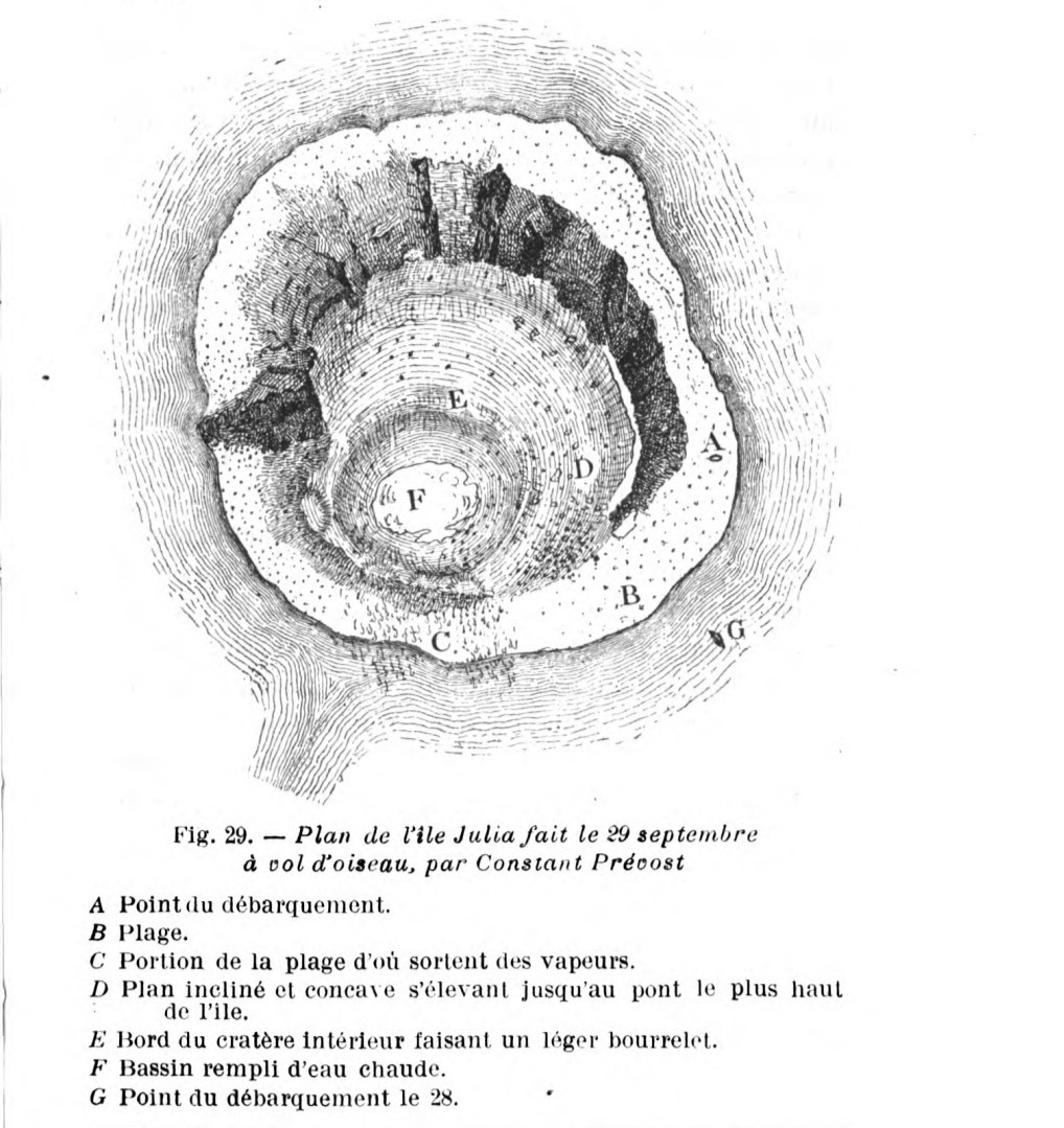 [p. 105] “L’île Julia n’a pas été formée par soulèvement du sol […] Je pense, que cette île ne fut véritablement, ainsi que je l’avais dit, qu’un sommet de cône d’éruption parfaitement semblable par sa forme, par sa nature, par la disposition des matériaux qui entraient dans sa composition et par son origine, aux sommets de l’Etna et du Vésuve, qui me parurent toujours lui ressembler en tout point”.