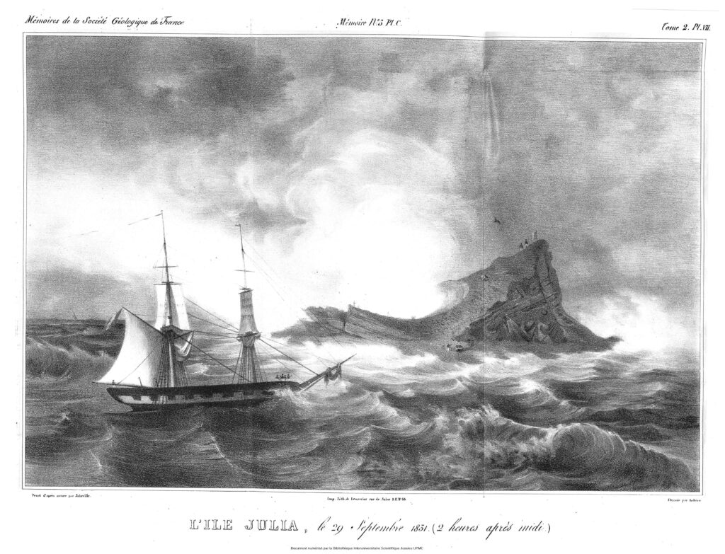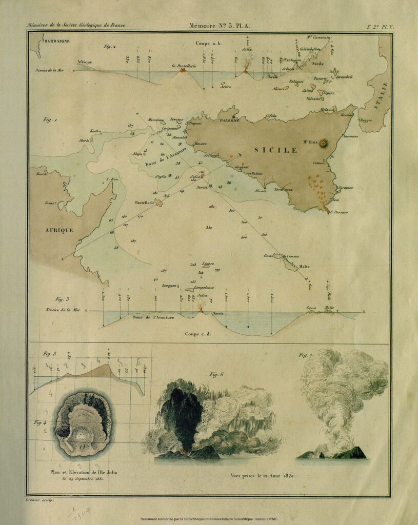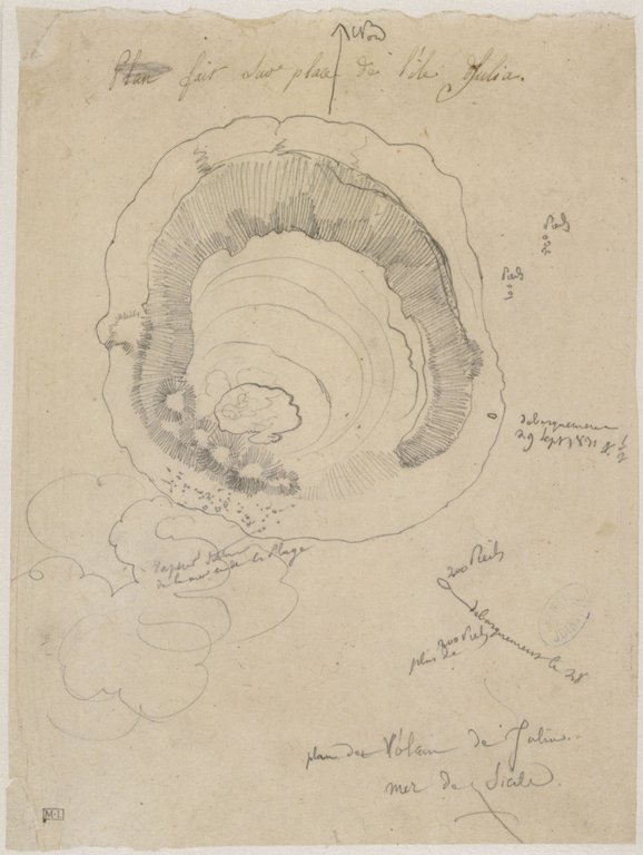 Constant PRÉVOST, ‘Notes sur l’île Julia : pour servir à l’histoire de la formation des montagnes volcaniques’, in Mémoires de la Société Géologique de France, 2, 1835, pp. 91-127. Litografie. Tav. A. Disegnatore: Constant PRÉVOST? Litografo: GRÉNIER. Tav. C. Da un dipinto a olio di Antoine-Edmond JOINVILLE. Disegnatore: LELIÈVRE. Litografo: Litographie Joseph-Rose LEMERCIER.