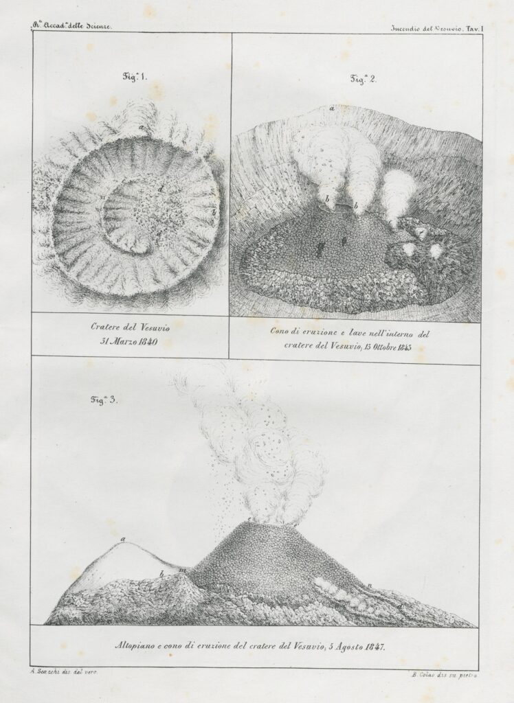 La tav. I propone tre vedute del cratere del Vesuvio, rispettivamente nel suo stato alla fine di marzo del 1840, a metà ottobre 1843 e all’inizio di agosto 1847. A partire dal 1841, si andò formando un cono all’interno del cratere. La fig. 2, bb mostra le due bocche di eruzione sul suo vertice, che eruttavano indipendentemente l’una dall’altra. Nel 1845, il nuovo cono superò l’altezza del bordo del cratere e nel 1846, ormai divenuto cono principale, oltrepassò la punta del Palo (tav. I, fig. 3, a).