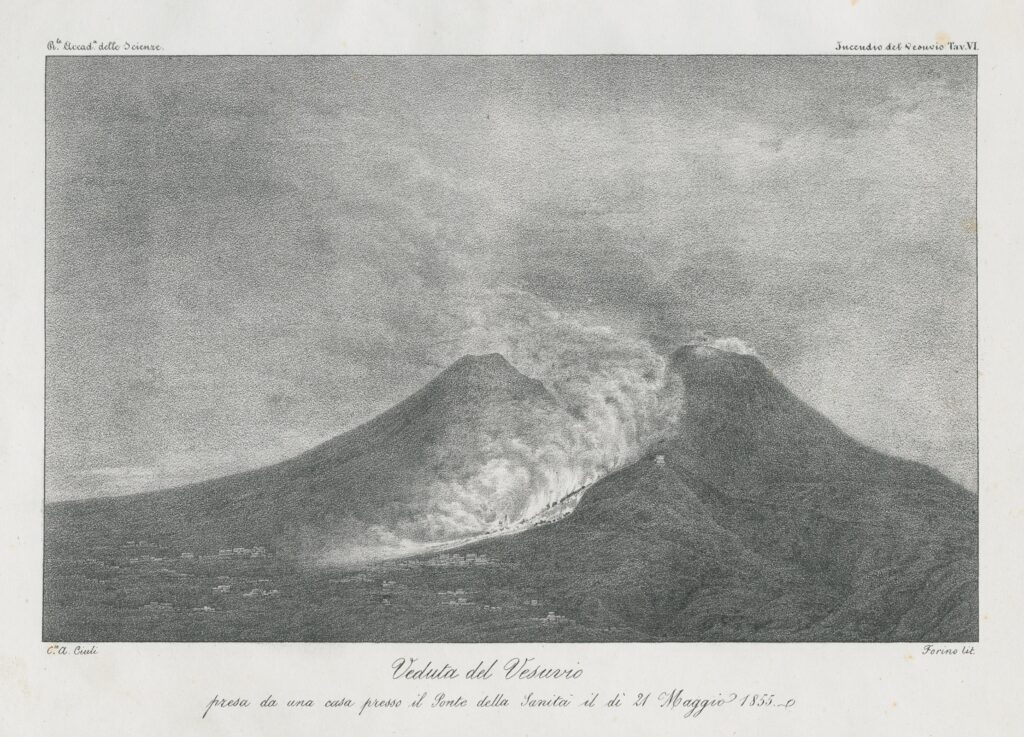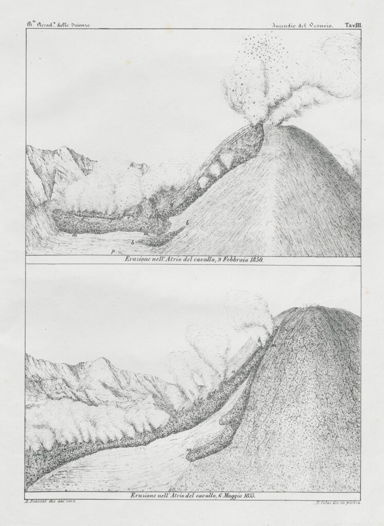 Le sei tavole qui analizzate fanno quindi riferimento a entrambe le eruzioni del 1850 e del 1855, ma riepilogano i mutamenti del Vesuvio a partire dal 1840, con particolare attenzione a quelli avvenuti all’interno del cratere. Esse includono inoltre una mappa con l’indicazione delle “principali lave di epoca istorica” (tav. V) e una veduta del vulcano in eruzione nel 1855, presa nei pressi del Ponte della Sanità a Napoli (tav. VI).