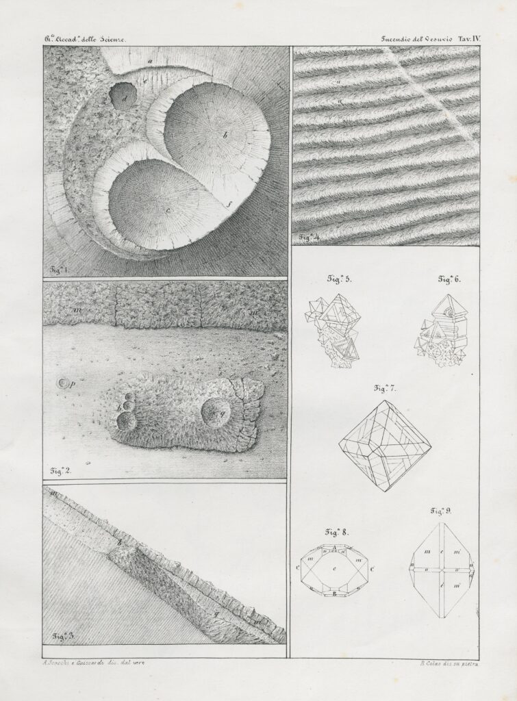 Le figure 5-9 della tav. IV rappresentano la struttura di alcuni cristalli analizzati dagli autori nella zona dell’eruzione del 1855. Si tratta di cristalli ottaedrici di magnetite con oligisto, di cianocromo (solfato di potassio e rame idrato, fig. 8) e di pirotecnite (sodio solfato anidro, fig. 9)